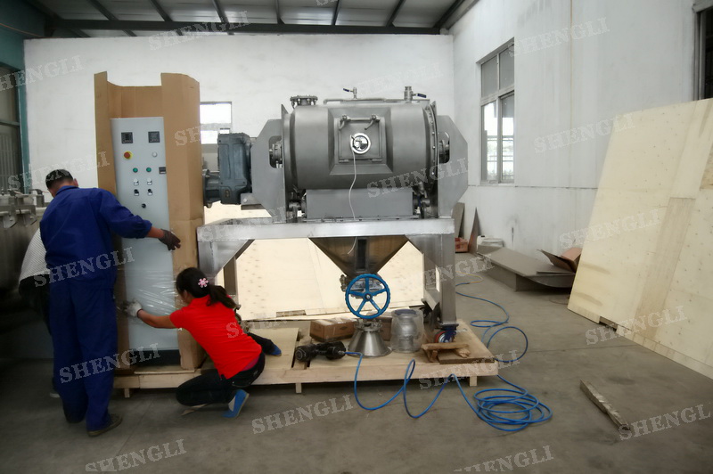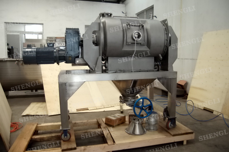 設備配置:配置F系列減速機,平行安裝;筒體外設導熱介質夾套;開設快開式檢修門;出料口采用氣動翻板閥;設備主軸采用氣密封;筒內設加液噴頭;設備內表面鏡面拋光、外表面噴砂亞光。