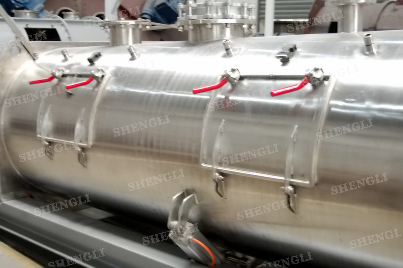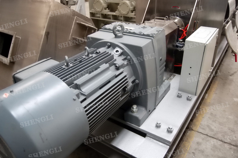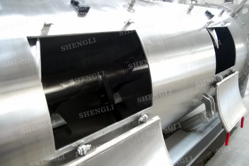 設(shè)備配置:配置SEW品牌R系列減速機,平行安裝;筒側(cè)開設(shè)快開式檢修門附安全開關(guān);出料口采用氣動翻板閥;筒體上設(shè)置噴液噴頭;設(shè)備主軸采用氣密封;設(shè)備內(nèi)、外表面拉絲亞光。