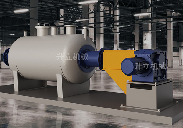 具有臥式筒體,內裝螺帶旋轉軸,軸上內、外螺帶相互推送物料,攪刀快速翻轉物料,在高溫狀態(tài)下使物料不停運動實現動態(tài)均勻受熱。